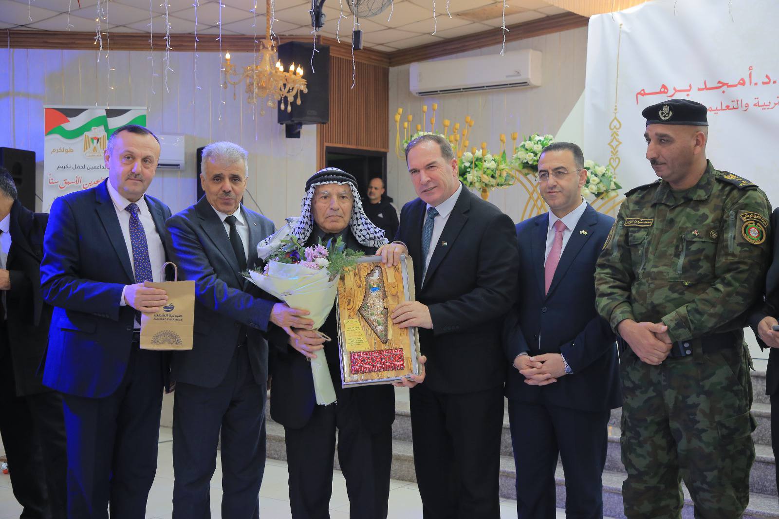 وقال المحافظ اللواء د. كميل إن هذا التكريم يأتي باسم فخامة السيد الرئيس محمود عباس “أبو مازن”، تقديراً للمعلمين والمعلمات المتقاعدين الأسبق سناً على مستوى المحافظة، موجهاً التحية لهذه القامات التربوية.